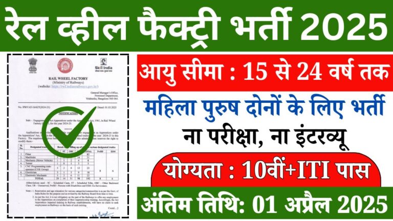 WhatsApp Group Join Now Telegram Group Join Now रेल व्हील फैक्ट्री भर्ती 2025:रेल व्हील फैक्ट्री में 10वीं पास अभ्यर्थियों के लिए बिना परीक्षा भर्ती का नोटिफिकेशन जारी कर दिया गया है। इस भर्ती के तहत 192 पदों पर नियुक्ति की जाएगी। ऑनलाइन आवेदन प्रक्रिया 1 मार्च 2025 से शुरू हो चुकी है और अंतिम तिथि … Continue reading Rail Wheel Factory Vacancy: रेल व्हील फैक्ट्री भर्ती का 10वीं पास के लिए बिना परीक्षा नोटिफिकेशन जारी